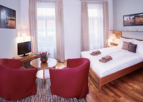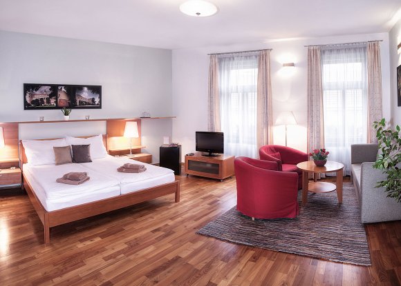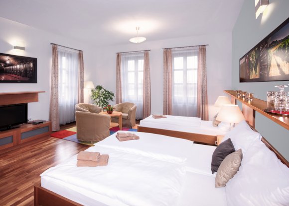 LCD TV, satellite, air conditioning, internet, minibar, safe, hot drink set (kettle, coffee, tea, sugar, cream), WC, bathroom with shower, hair dryer, umbrella, 2 chairs, sofa bed, lamp + table lamps